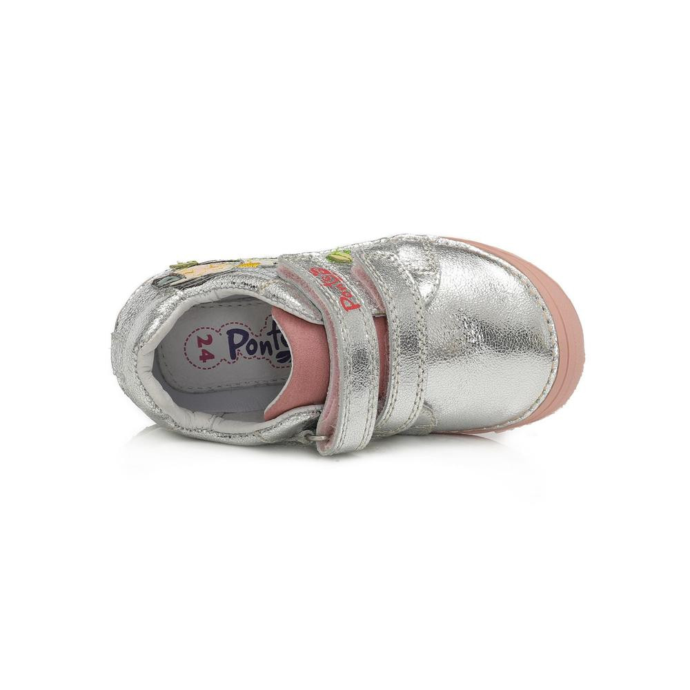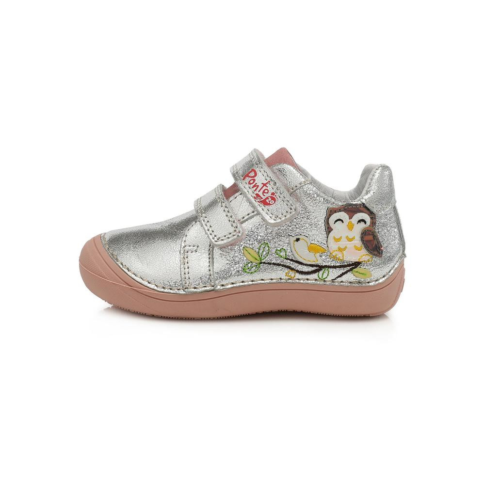 Ponte20 supinált gyerekcipő lányoknak ezüst színben, oldalán bagoly+kismadár díszítéssel,