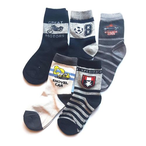 5 pár fiú zokni - fekete-szürke munkagépes, focis, motoros, vegyes mintával